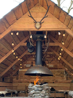 Wildhut met dakcoating (rubber-seal), rondom houten U-bank, vuurpit & rookkanaal.